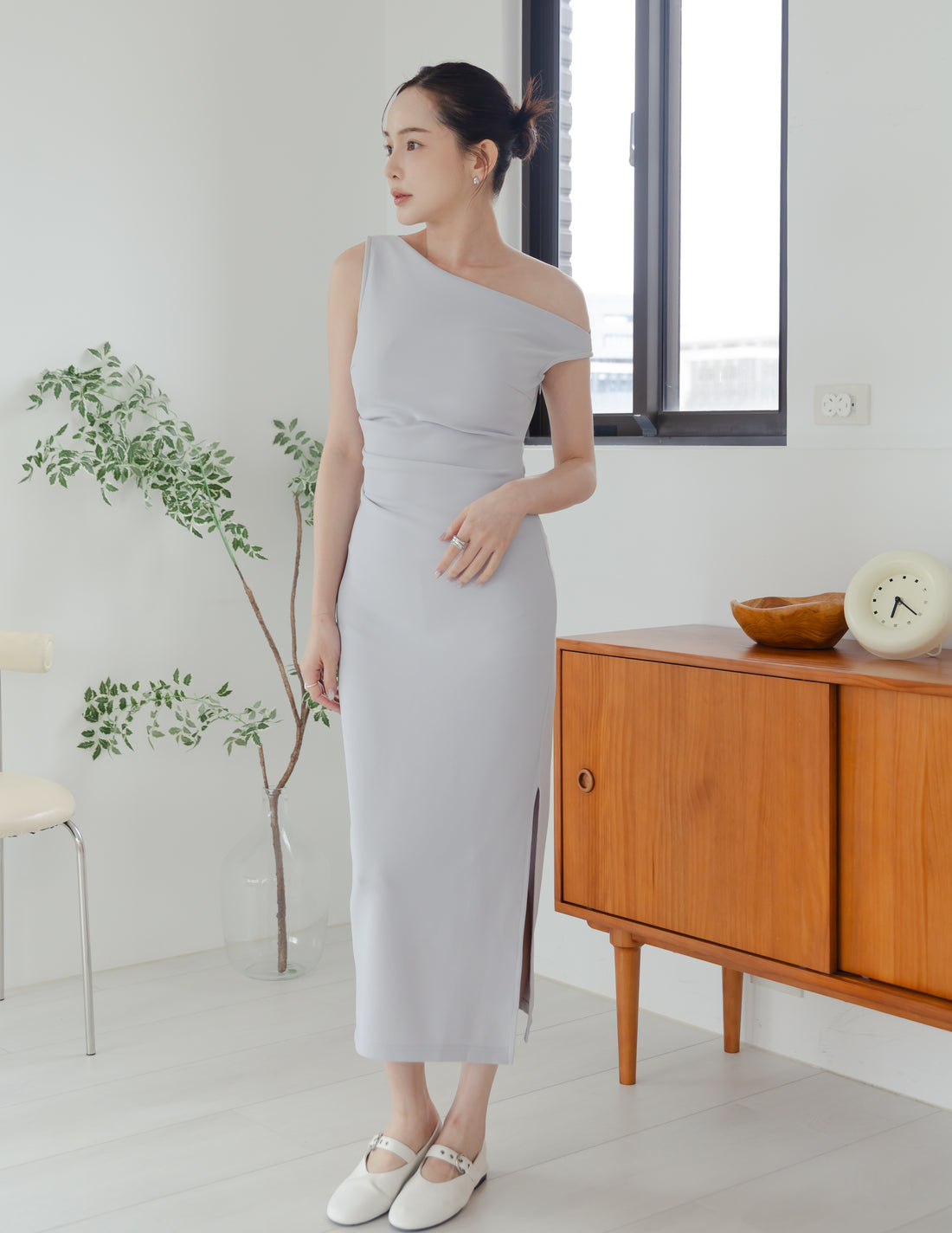 Carys Off Shoulder Midi Dress in Grey Blue