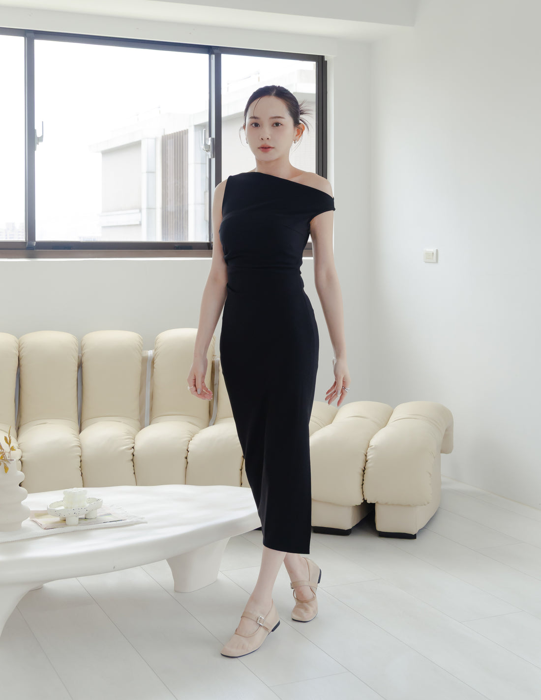 Carys Off Shoulder Midi Dress in Black